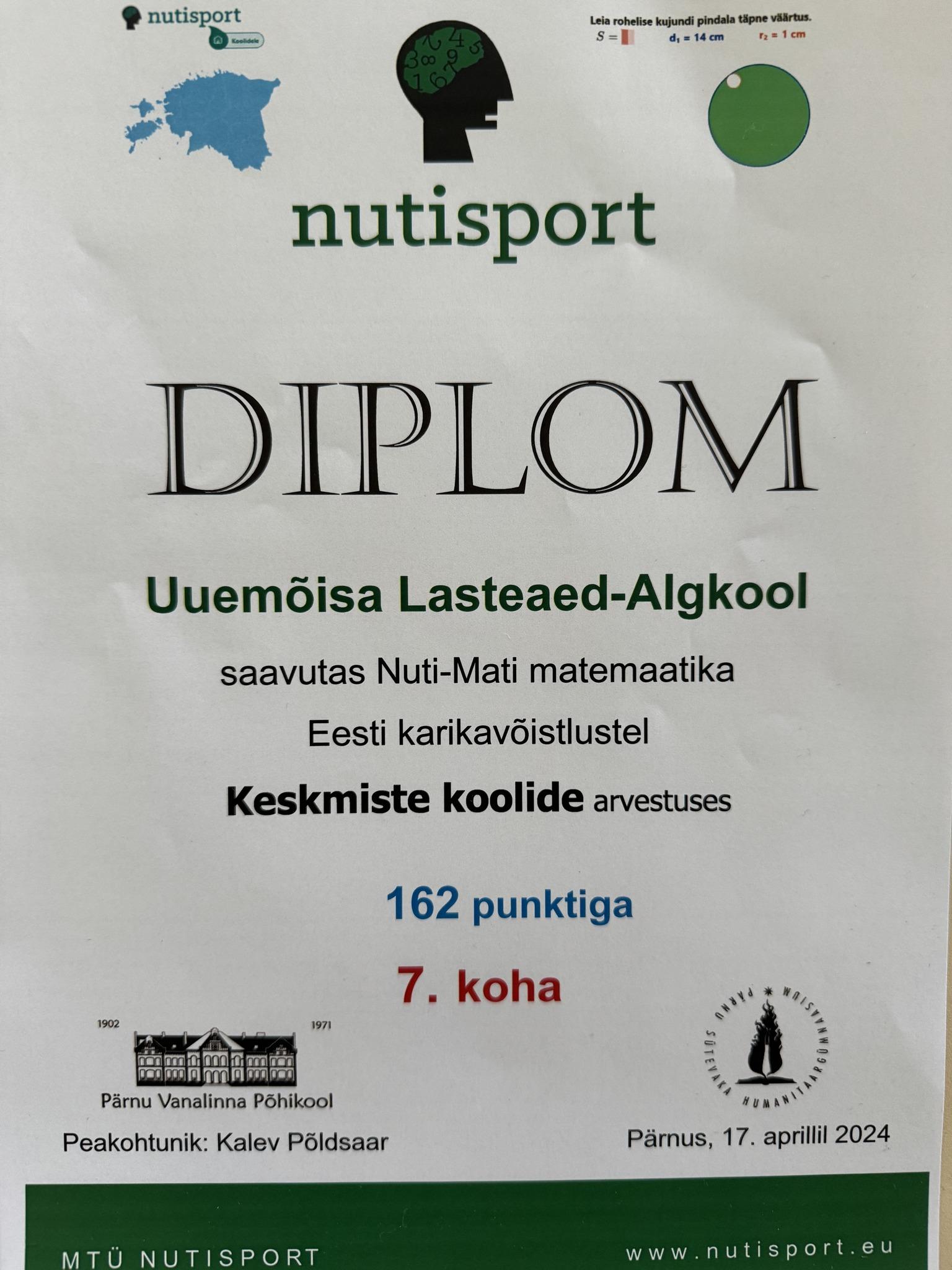 17. aprillil toimusid Pärnus Nuti-Mati matemaatika Eesti karikavõistlused. Meie kooli võistkond, koosseisus Ralph Robert Viiret, Karl Oskar Kurst ja Brent Saroos, saavutasid suurepärase 7. koha. Kiidame väga tublisid matemaatikuid, nende juhendajaid ning täname abilisi, tänu kellele lapsed Pärnusse võistlustele jõudsid.